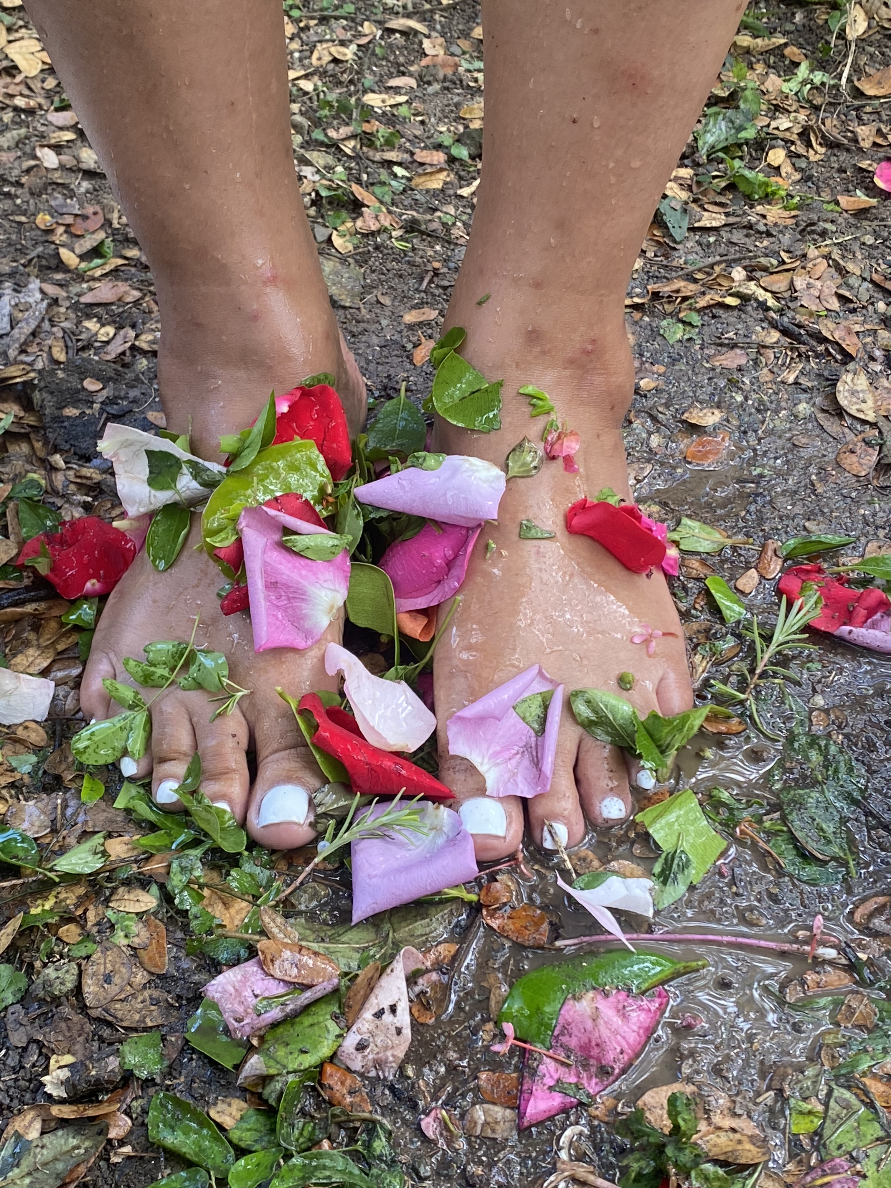We had two large containers of water, and everyone contributed to filling them with herbs, leaves, and local flowers, including fragrant rose petals. As we prepared the baths, excitement filled the air as the women reminisced about receiving bush baths as children and the familiar scent of bay leaf stirred old memories. We let the water warm in the sun while we meditated and journaled, allowing time for reflection.